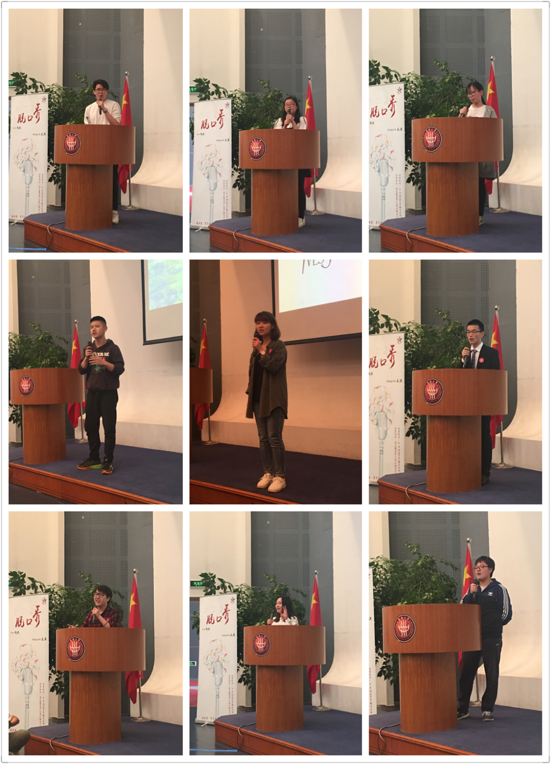 经过选拔,10名选手从报名的35人中脱颖而出。决赛共分两轮,第一轮根据当今社会热点发表选手自己的观点。这些社会热点涉及政治经济、文化生活等各个方面,如美联航事件、网红食品排队现象、《人民的名义》热播等,选手们的妙语连珠赢得台下观众热烈的掌声,他们分析问题的角度、阐述问题的看法也引发了现场同学对这些热点问题的思考。第二轮的比赛融入了传统文化的元素,即兴戏说诗词。选手根据赛前公布的诗词范围进行抽签,即兴演绎对诗词的理解。选手们发挥稳定,利用诗词中的重点词汇加以分析并延伸表演,给现场观众带来了一场听觉盛宴。值得一提的是,本次大赛采取现场互动的形式,观众可以扫码在微信墙上留言,短短一个多小时的赛程吸引了近百人参与,留言数量达到三百余条。