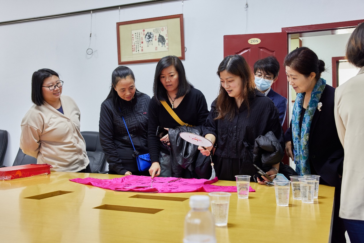 其后,回访小组与恒源祥集团党委书记顾红蕾等进行了座谈。顾书记向老师们介绍,恒源祥集团目前有上海绒绣和海派绒线编结技艺两个非遗工作室,工作室除了完成日常订单制作外,还致力于非遗教育与传承事业,多次与学校合作开展项目:建党百年时,恒源祥与各中小学、高校合作,开展共绣党旗活动,提供绣制工具、绒绣培训,绣制了百面党旗;今年三月,恒源祥集团联合全国雷锋学校大联盟的师生编织“雷锋花”,献给中共一大纪念馆收藏以及装点雷锋纪念馆的花篮,致敬雷锋精神。柯玲表示,这些特色活动将非遗传承与学校德育相连接,展现了非遗教育传承中企业宝贵的文化担当精神,同时感谢在自己主持的上海绒绣相关课题研究中恒源祥所给予的支持和帮助,并赠送了课题研究又一学术成果《上海绒绣研究》(艺术人像)分册。张顺爱老师惊喜地发现,恒源祥的非遗传承实践案例是很好的课程思政素材。